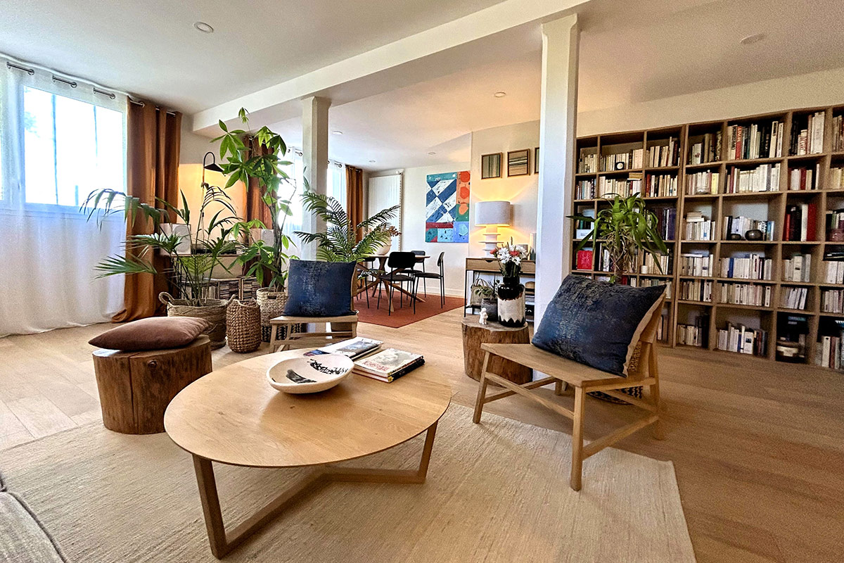 Dans cet intérieur baigné de lumière, la nature s’invite avec une harmonie subtile entre matières brutes, teintes chaleureuses et mobilier organique. Le bois, omniprésent, façonne un cadre authentique et enveloppant, où chaque détail exprime une simplicité raffinée.