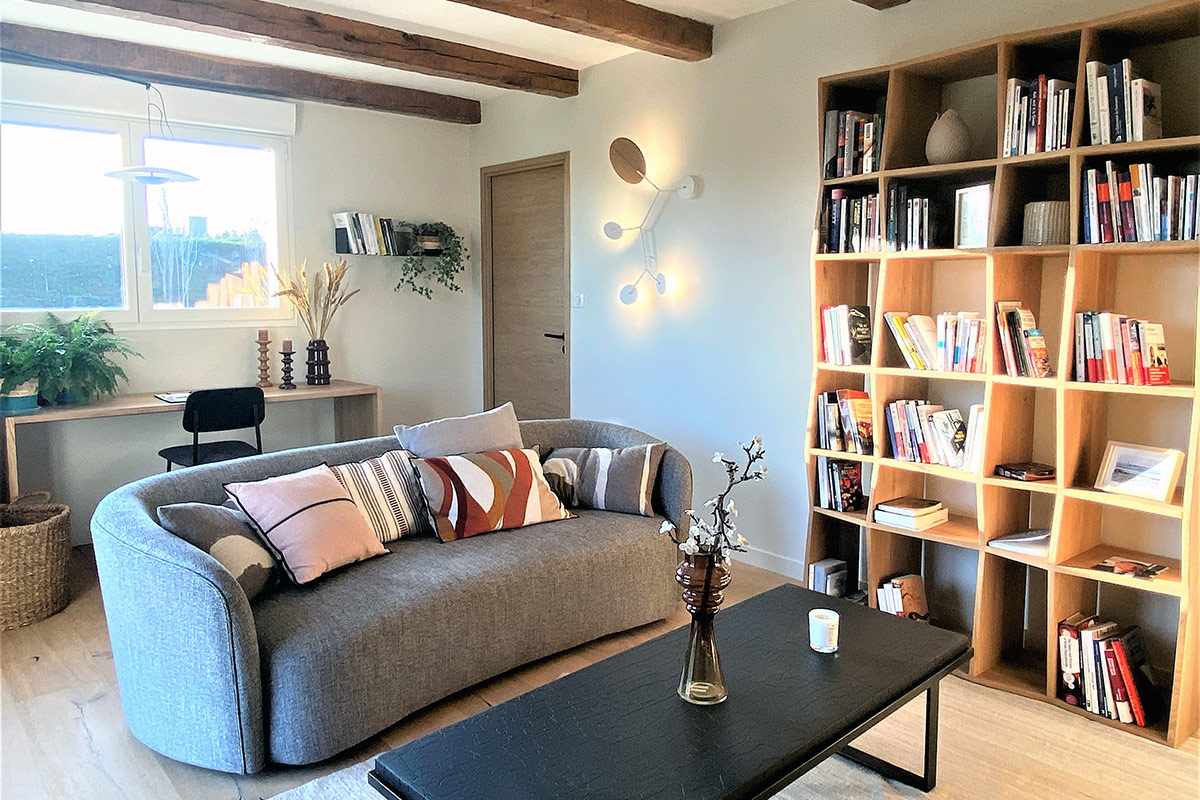 Dans ce bureau pensé pour s’adapter à plusieurs usages, la zone télévision a été intégrée avec soin afin de respecter la volonté des clients de séparer les fonctions de détente et de réception. Le canapé arrondi, agrémenté de coussins aux motifs graphiques et chaleureux, invite au confort tout en apportant une touche de modernité. La bibliothèque, avec ses niches irrégulières en bois clair, donne du caractère à l’ensemble et offre une belle capacité de rangement. L’espace bureau, quant à lui, est épuré et fonctionnel, idéal pour travailler ou lire au calme. Les poutres apparentes et les décoratifs, comme le luminaire design et les vases en grès éléments, créent une ambiance chaleureuse et harmonieuse dans cet espace à la fois pratique et esthétique.